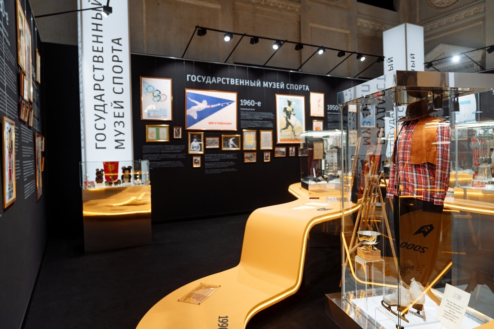 Выставочное пространство занимает два зала, в которых можно увидеть более 500 предметов: медали и знаки, спортивный инвентарь, архивные плакаты, документы, фотографии, а также личные вещи петербургских спортсменов — например, фигуриста Игоря Бобрина.