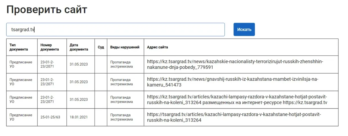 В разделе «Проверить сайт» указывается, что сайт телеканала заблокирован за пропаганду экстремизма. Причиной тому стали четыре материала издания. Последний из них вышел с заголовком «Казахские националисты терроризируют русских женщин накануне Дня Победы». Три предписания были вынесены 31 мая, самый первый — в январе 2021 года.