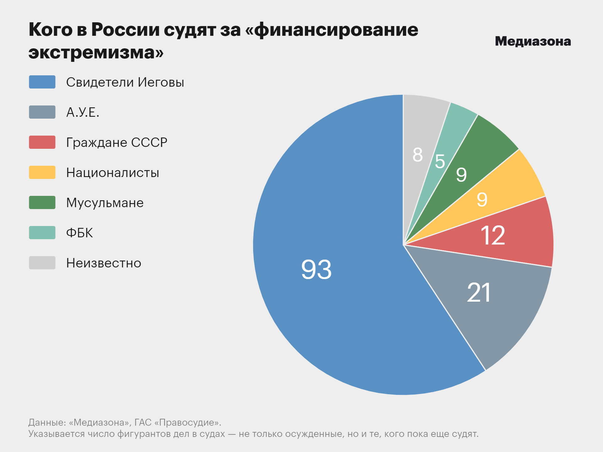 Значительная часть дел о финансировании экстремизма тоже касалась этих верующих: 36 случаев из 81 известного (часто судят по несколько человек сразу, среди фигурантов «свидетелей» оказалось 93 человека из 157). А вот националистов и мусульман по этой статье преследуют редко (несмотря на огромное количество ультраправых или исламских организаций, признанных экстремистскими).