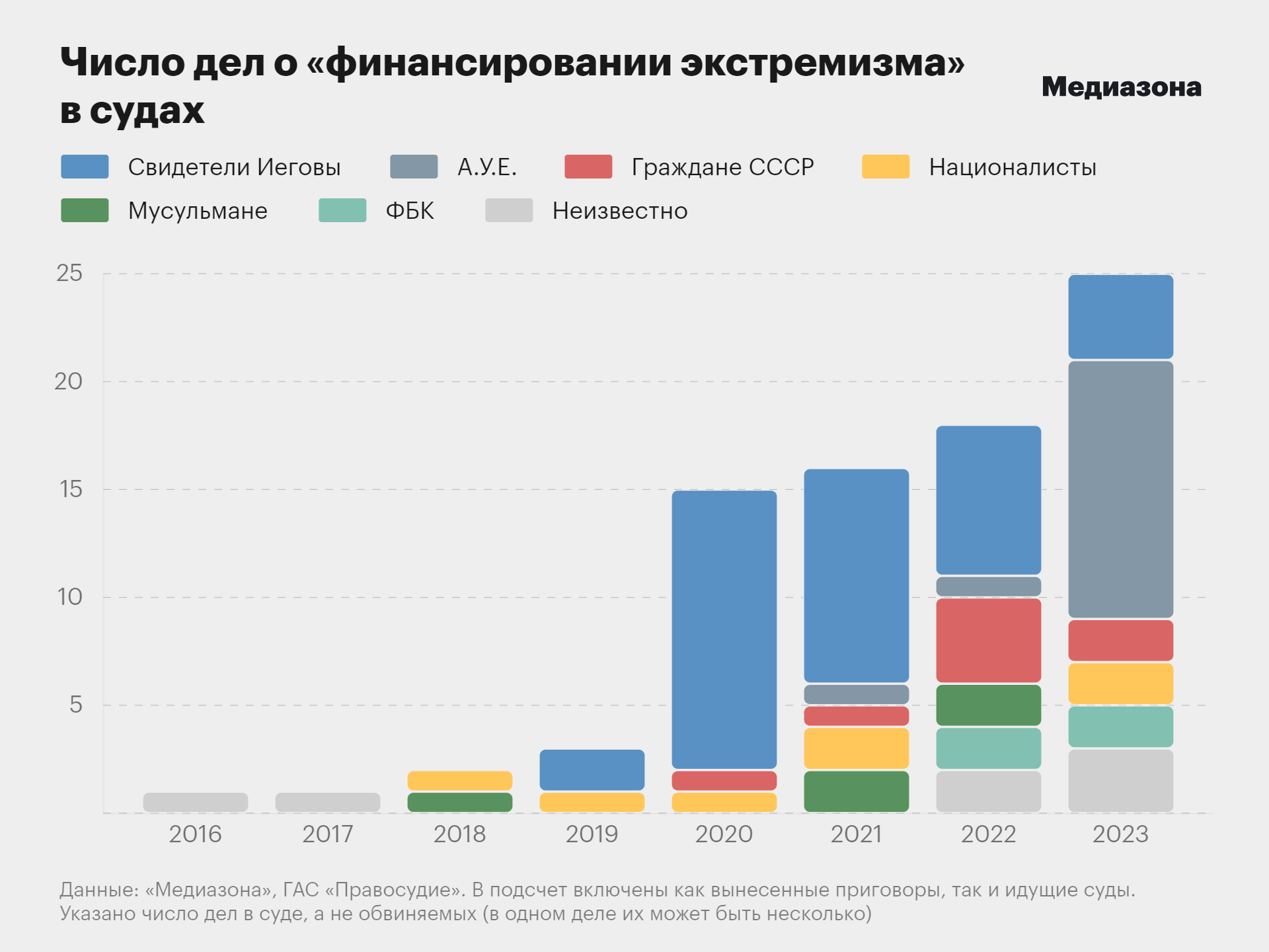 Преследование по этой статье вообще постоянно набирает обороты: только за первые семь месяцев 2023 года в суды уже поступило рекордное число дел о финансировании экстремизма (25 дел против 18 за весь 2022-й).