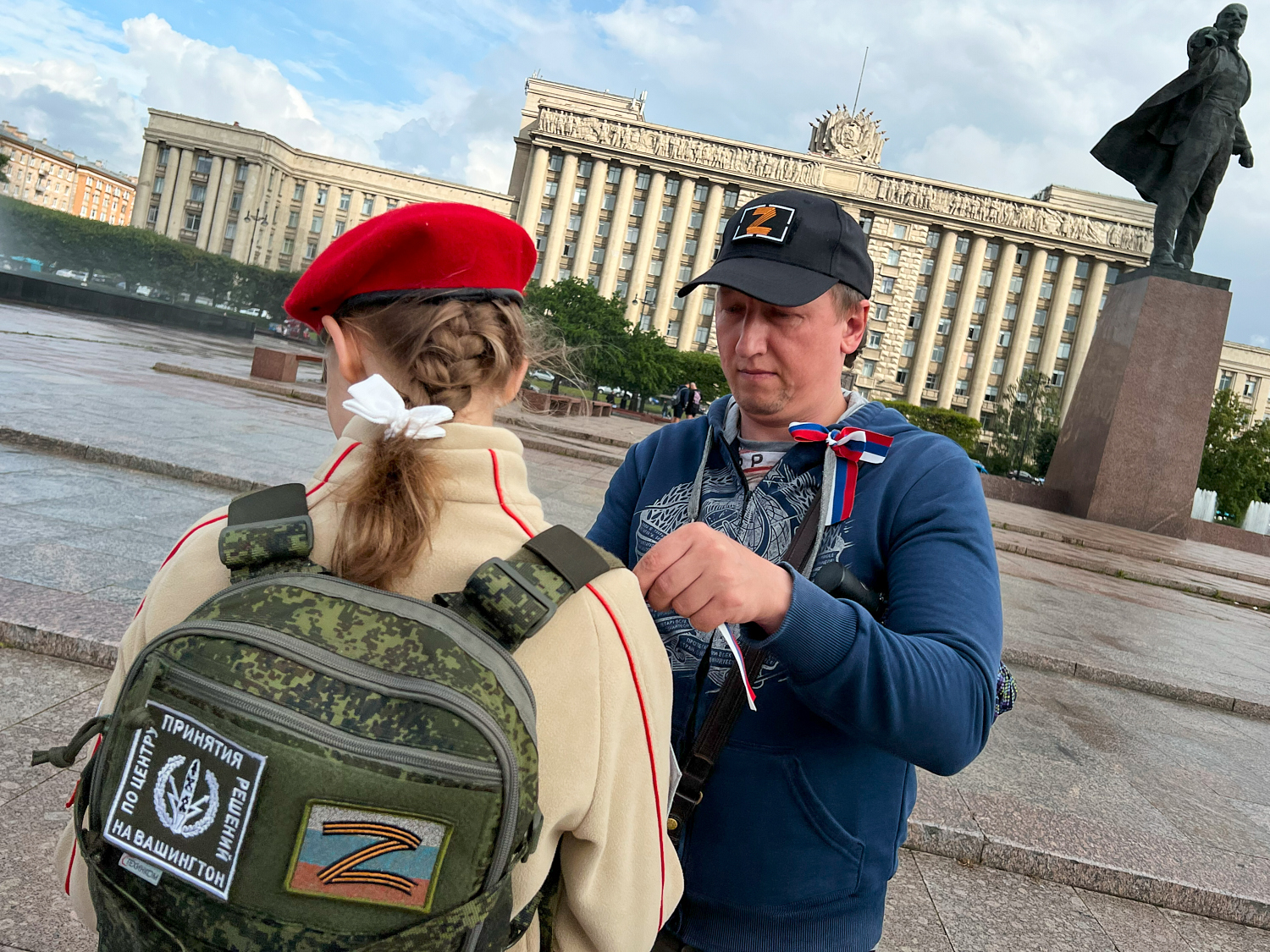 На площади перед Михайловским замком 1,5 тысячи активистов «Волонтерской роты» и «Молодой гвардии», одетые в белое, красное и синее, выстроились по цветам триколора.