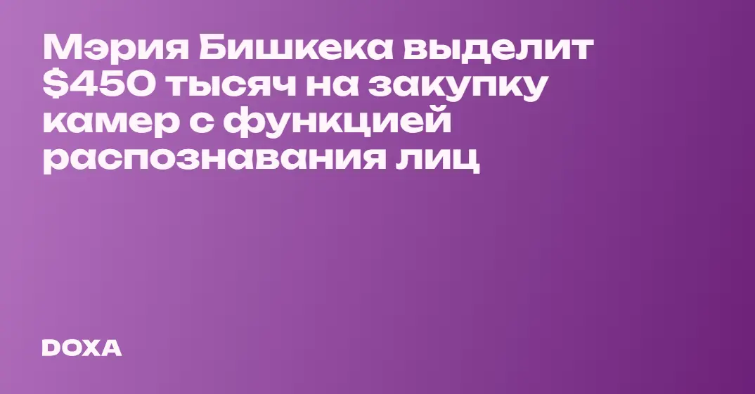 Мэрия Бишкека планирует выделить 40По курсу на момент публикации -- 453 тысячи долларов миллионов сомов на закупку камер видеонаблюдения с функцией распознавания лиц, говорится в проекте соглашения между одним из муниципалитетов и МВД.