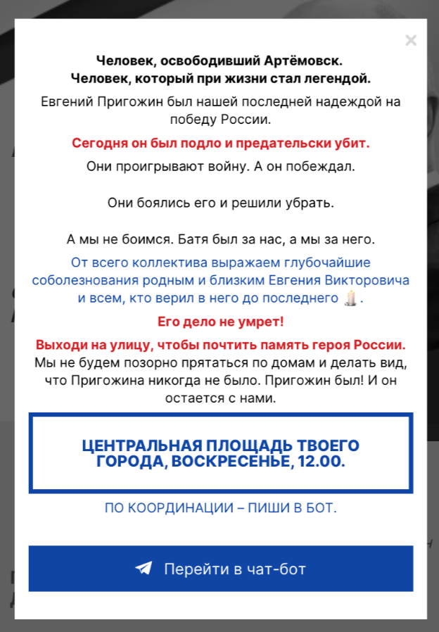 На «предвыборном сайте» Пригожина, а также в боте, ссылка на который опубликована на этом сайте, появилось сообщение о митинге в честь Пригожина. Однако нет никаких оснований утверждать, что сайт и бот действительно связаны с Пригожиным или его сторонниками.