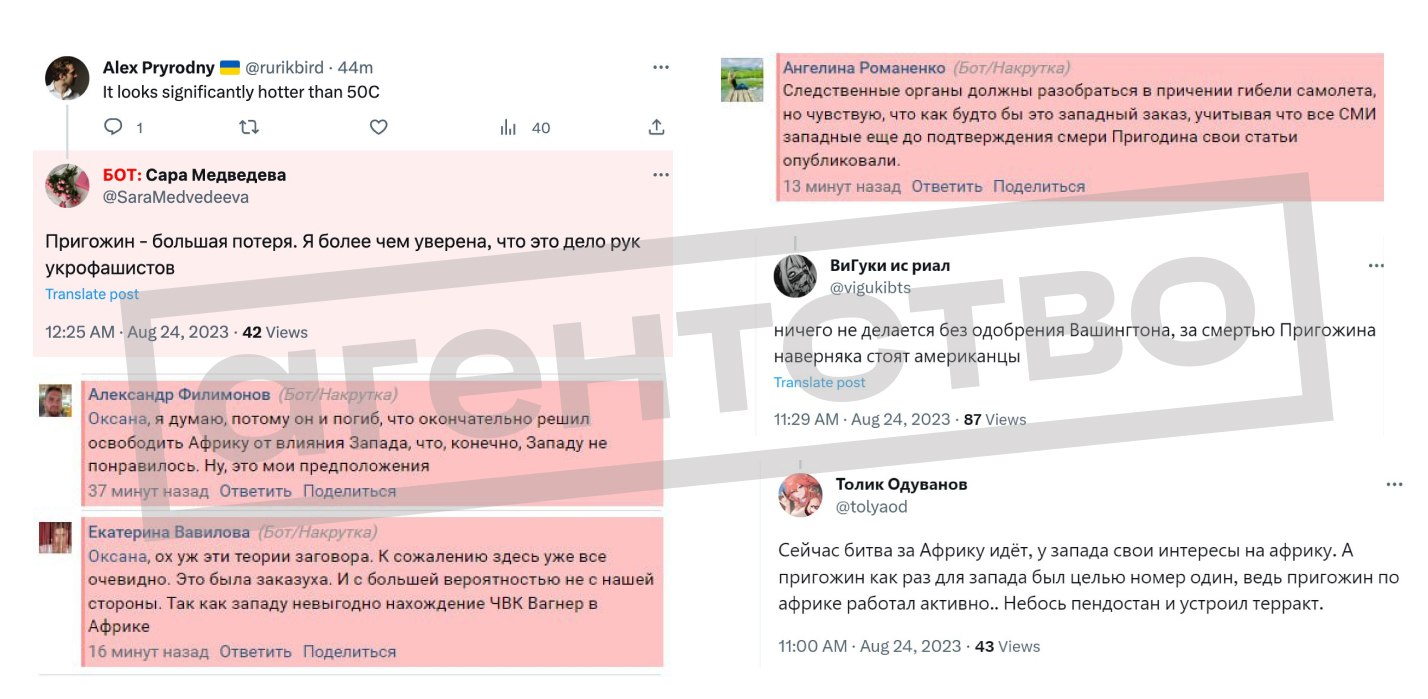 «Агентство» ознакомилось с некоторыми комментариями, которые в сети VK оставляют аккаунты, причисляемые проектом «Ловушка повара» к ботам: «Понятно, кто мог сотворить такое – Запад не изменяет своим традициям», «Запад убирает человека, который начал устанавливать порядки в Африке», «Потому он и погиб, что окончательно решил освободить Африку от влияния Запада», а также «у Путина никаких мотивов не было убивать Пригожина».