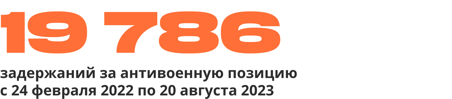 Нам известно о 19 096 задержаниях непосредственно на акциях, и о 326 — после них. За посты в соцсетях, частные разговоры, символику и другое — 364 задержаний.