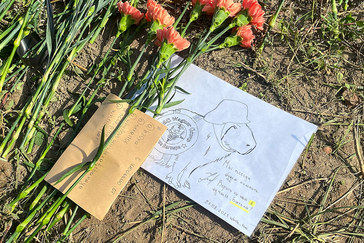 Когда мемориал уже был завален цветами, флагами, шевронами и украшался кувалдой, подошла девушка — она положила рисунок с капибарой в каске и эмблемой ЧВК и надписью: «Мы всегда будем помнить. Верить ли нам в лучшее, Батька?»