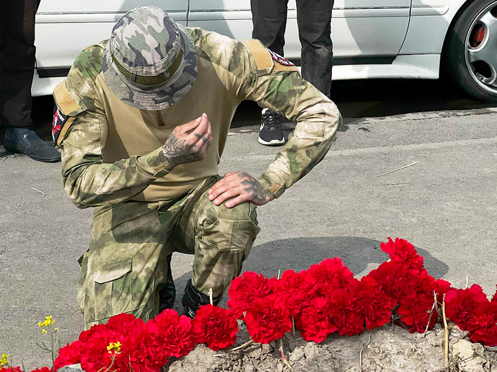 В один момент боец в маске упал у мемориала на колени, задрожал и заплакал. Это один из действующих солдат «Вагнера».