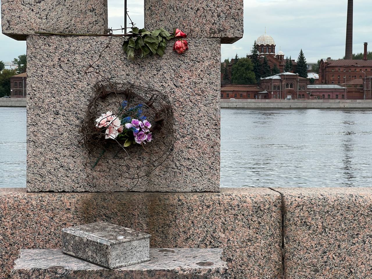 Цветы появились у памятника жертвам политических репрессий на Воскресенской набережной. По словам корреспондента «Бумаги», недалеко от памятника стоит автозак полиции.