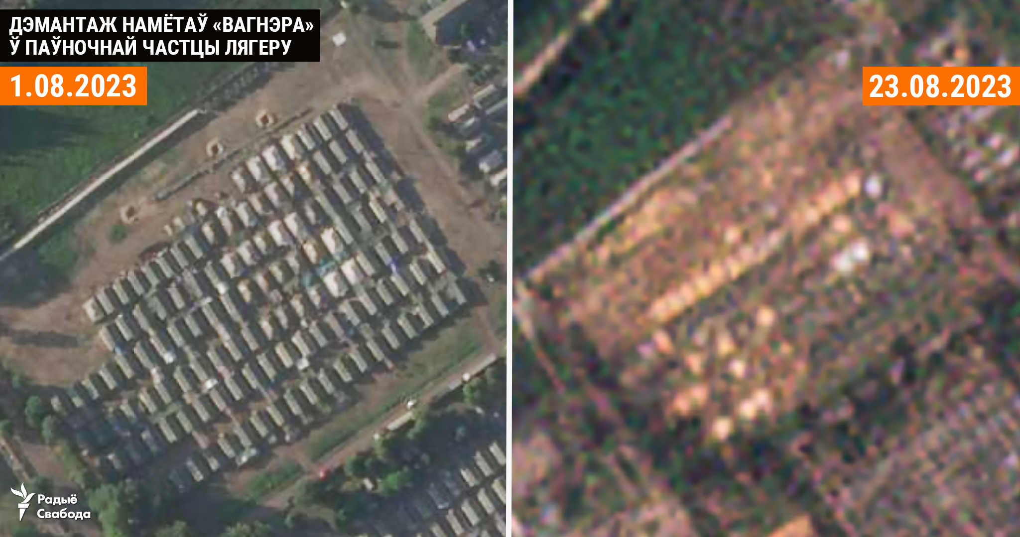 Лагерь ЧВК "Вагнер" под Осиповичами в Могилевской области Беларуси демонтируют, разобрана треть палаток, пишет белорусская служба Радио Свобода, изучившая полученный от компании Planet Labs спутниковый снимок от 23 августа.