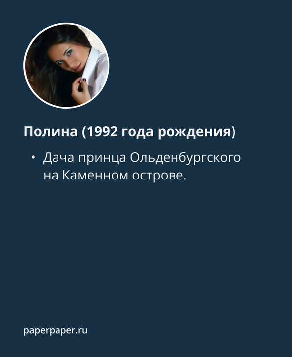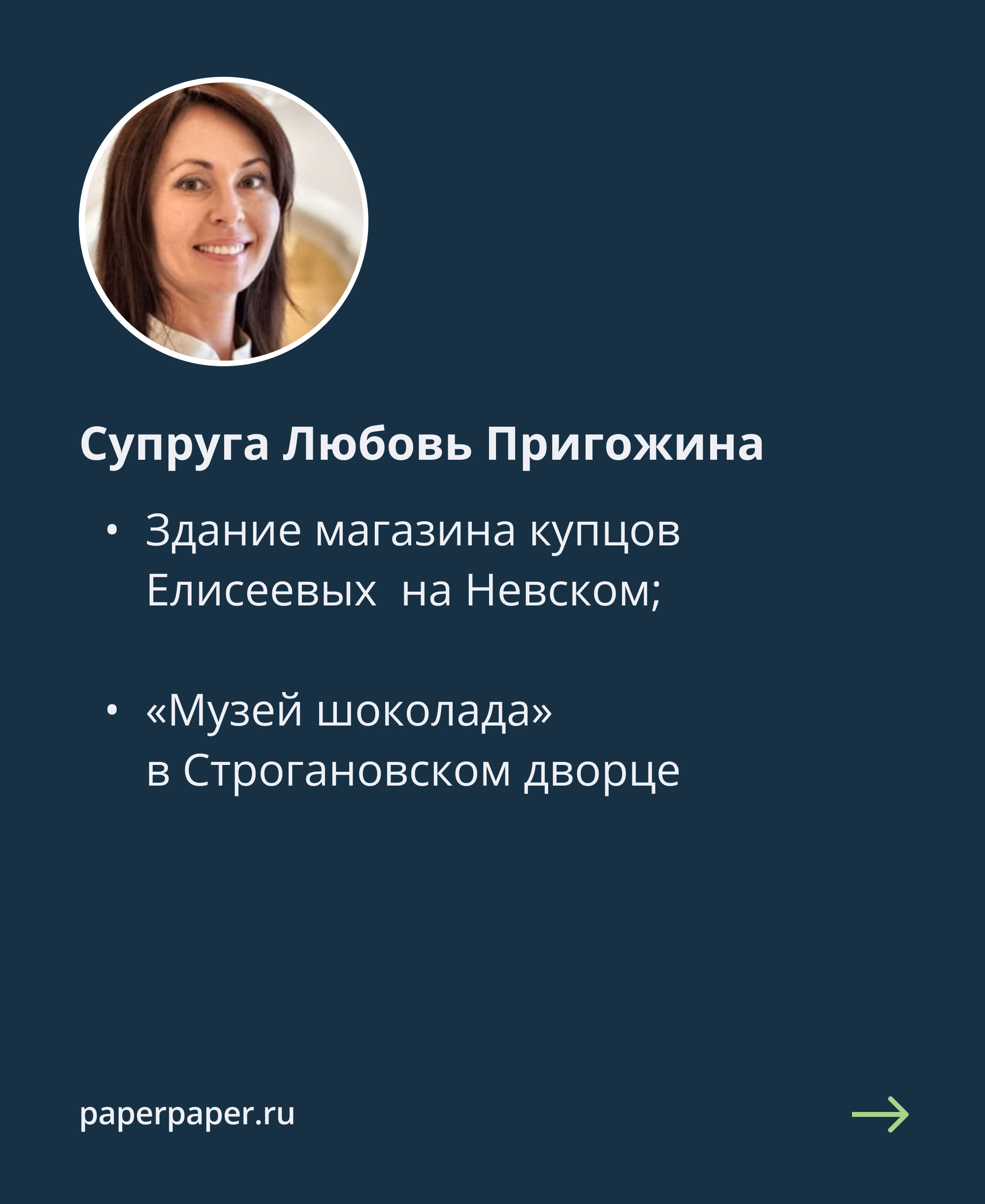 Дочь Пригожина Полина владеет дачей принца Ольденбургского в Петербурге, которая стоит 135 миллионов рублей. Она планирует сделать из нее отель, выясняли ФБК. Сейчас девушка зарегистрирована индивидуальным предпринимателем.