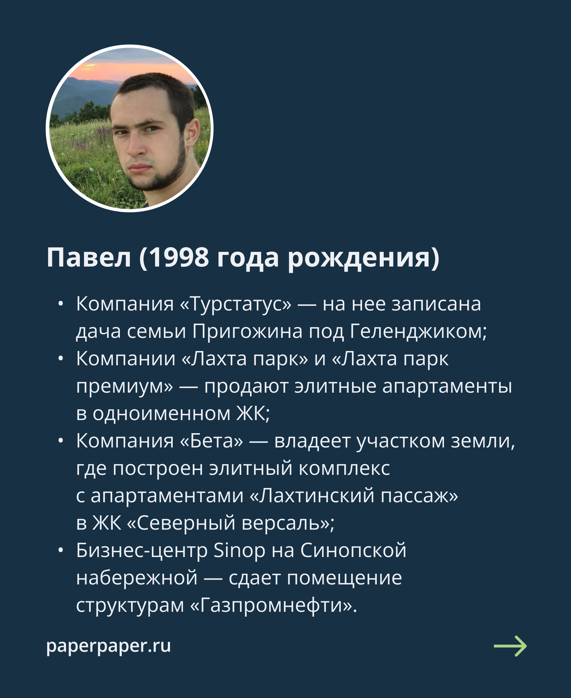 В Петербурге Павел управляет компаниями «Лахта парк» и «Лахта парк премиум», которые продают элитные апартаменты в одноименном ЖК напротив стеклянной башни «Газпрома» в Петербурге. До лета 2023-го Павел управлял также компанией «Лахта плаза», но сейчас там идет реорганизация.