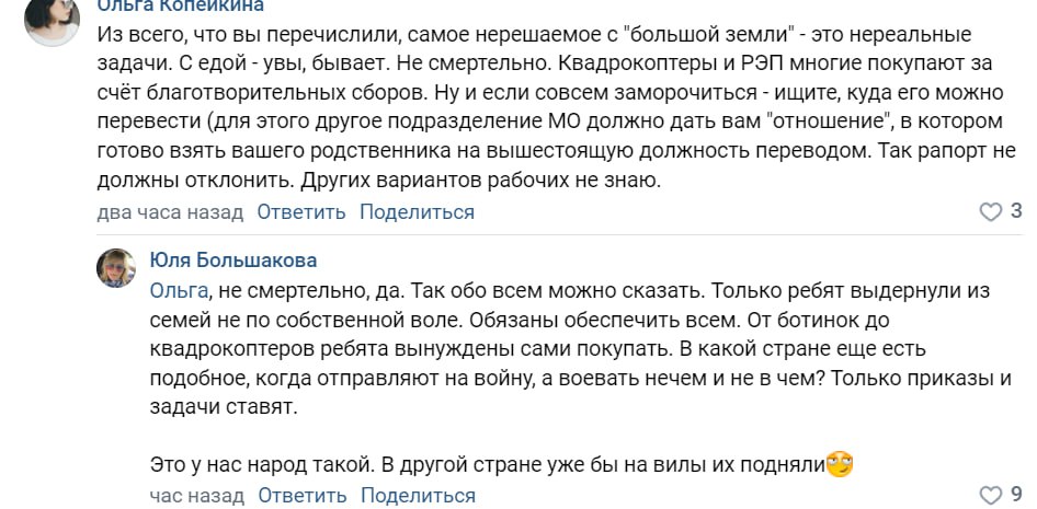 "Ребят выдернули из семей не по собственной воле. Обязаны обеспечить всем. А они все, от ботинок до квадрокоптеров, вынуждены сами покупать. В какой стране еще есть подобное, когда отправляют на войну, а воевать нечем и не в чем? Это у нас народ такой. В другой стране давно на вилы бы уже их (командование. – СР) подняли", – написала Юлия Большакова.