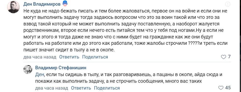 "Первое, он на войне, и, если они не могут выполнить задачу, тогда задаюсь вопросом, что это за воин такой, или что это за взвод такой, который не может выполнить задачу поставленную, а наоборот жалуется родственникам. Второе, если нечего есть – питайся тем, что у тебя под ногами", – сообщает Денис Владимиров, участник войны, внесенный в список сайта "Миротворец" как российский нацист, участник незаконного вооруженного формирования "Имперский легион".