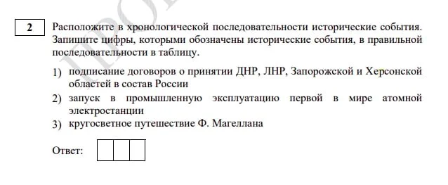 В одном задании одиннадцатиклассникам предлагают расположить в хронологической последовательности три события — «подписание договоров о принятии ДНР, ЛНР, Запорожской и Херсонской областей в состав России», запуск первой в мире атомной электростанции и кругосветное путешествие Фернана Магеллана.