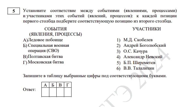 В другом — соотнести имена военачальников с событиями, в которых они принимали участие. Среди событий упоминаются «специальная военная операция», а среди участников — полковник самопровозглашенной ДНР Ольга Качура, погибшая в 2022 году.