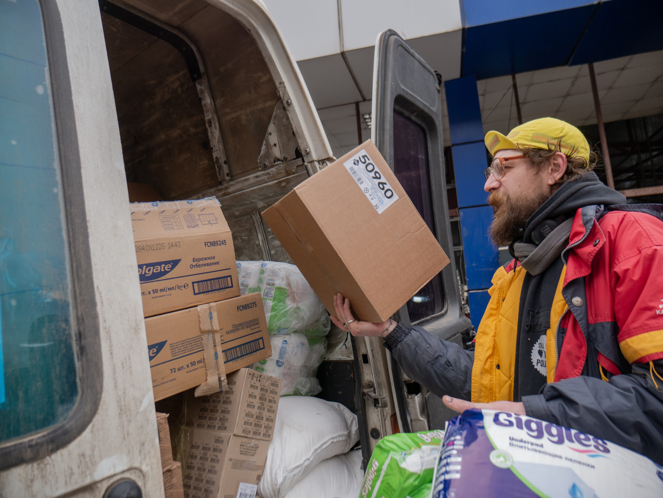 Потом машины стали ходить реже: сначала раз в неделю, потом раз в две, потом раз в месяц. Я с одной из них смог передать коробку родственникам в Чернигов. Они тогда уехали в деревню, чтобы можно было спрятаться в доме или в подвале, потому что город обстреливали. Коробка дошла. А потом машин не стало и мы начали раздавать гуманитарку, которую нам приносили, людям.