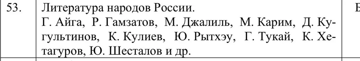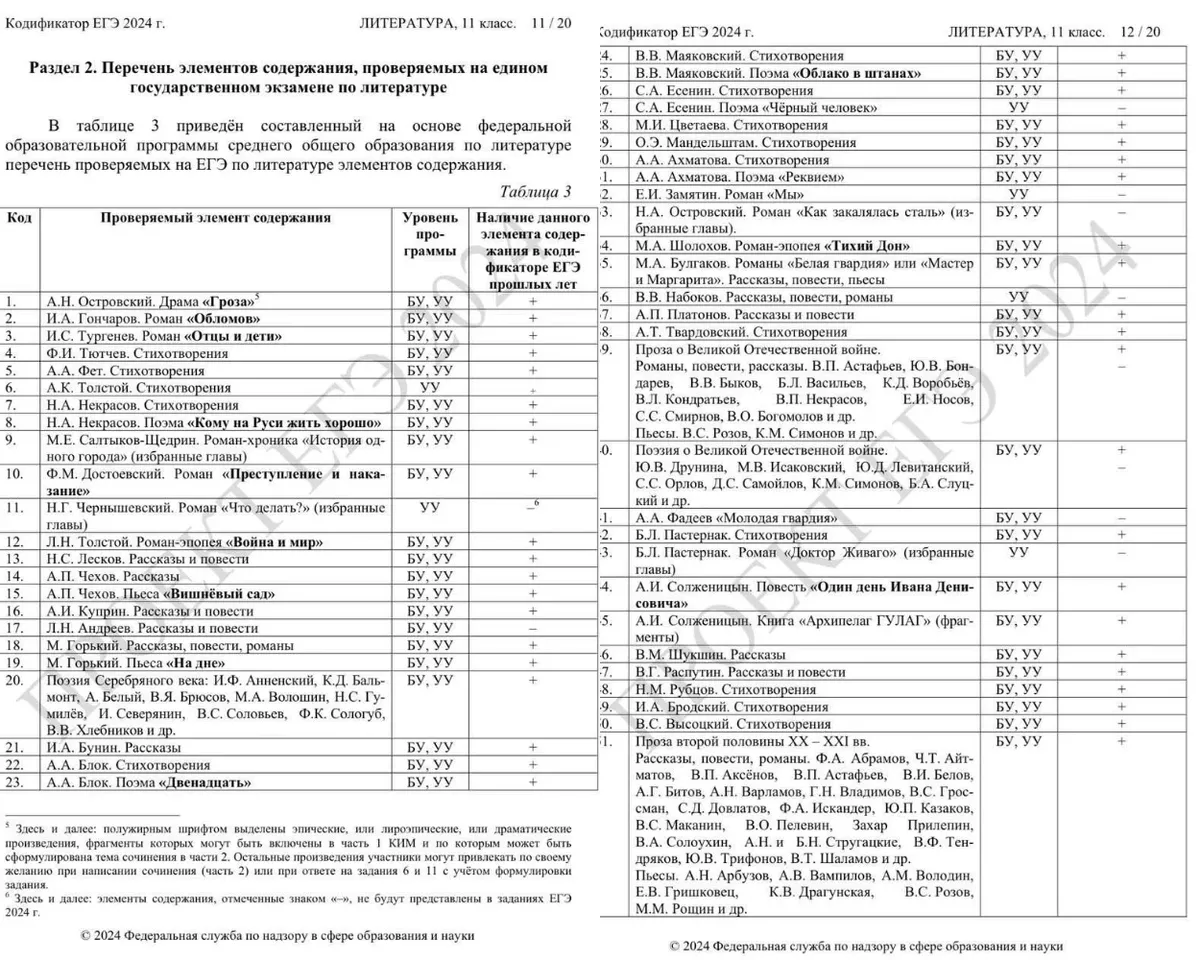 При этом в экзамен предлагается добавить разделы о литературе народов России, поэзии и прозе Великой Отечественной войны и роман Александра Фадеева «Молодая гвардия». В разделе о литературе народов России указан такой автор как «Г. Айга». Вероятно, имеется в виду чувашский поэт Геннадий Айги — составители допустили опечатку.