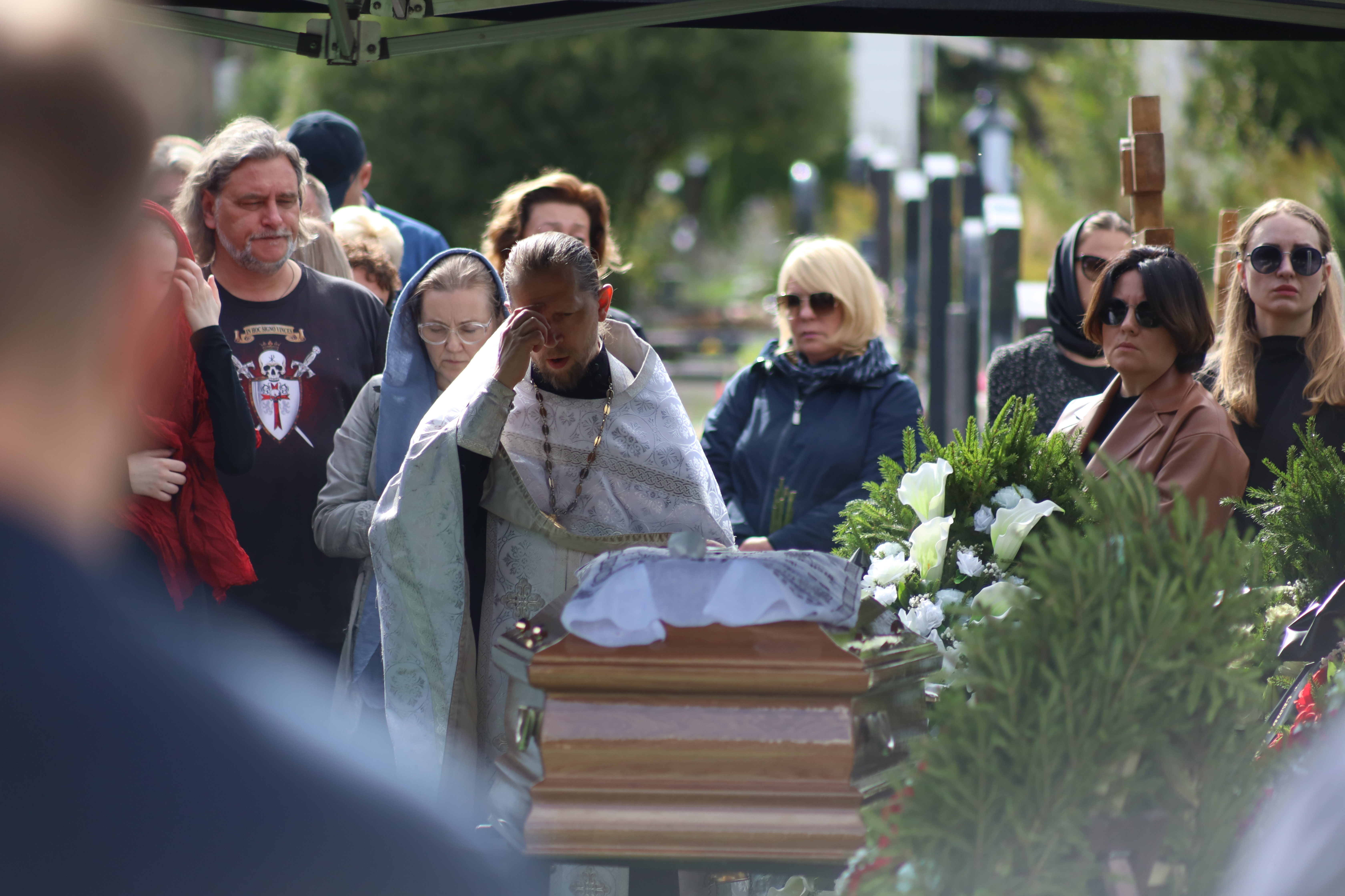 В церкви на кладбище идет отпевание. Часть пришедших людей стоит на улице, остальные - внутри. Журналистов в церковь не пускают.