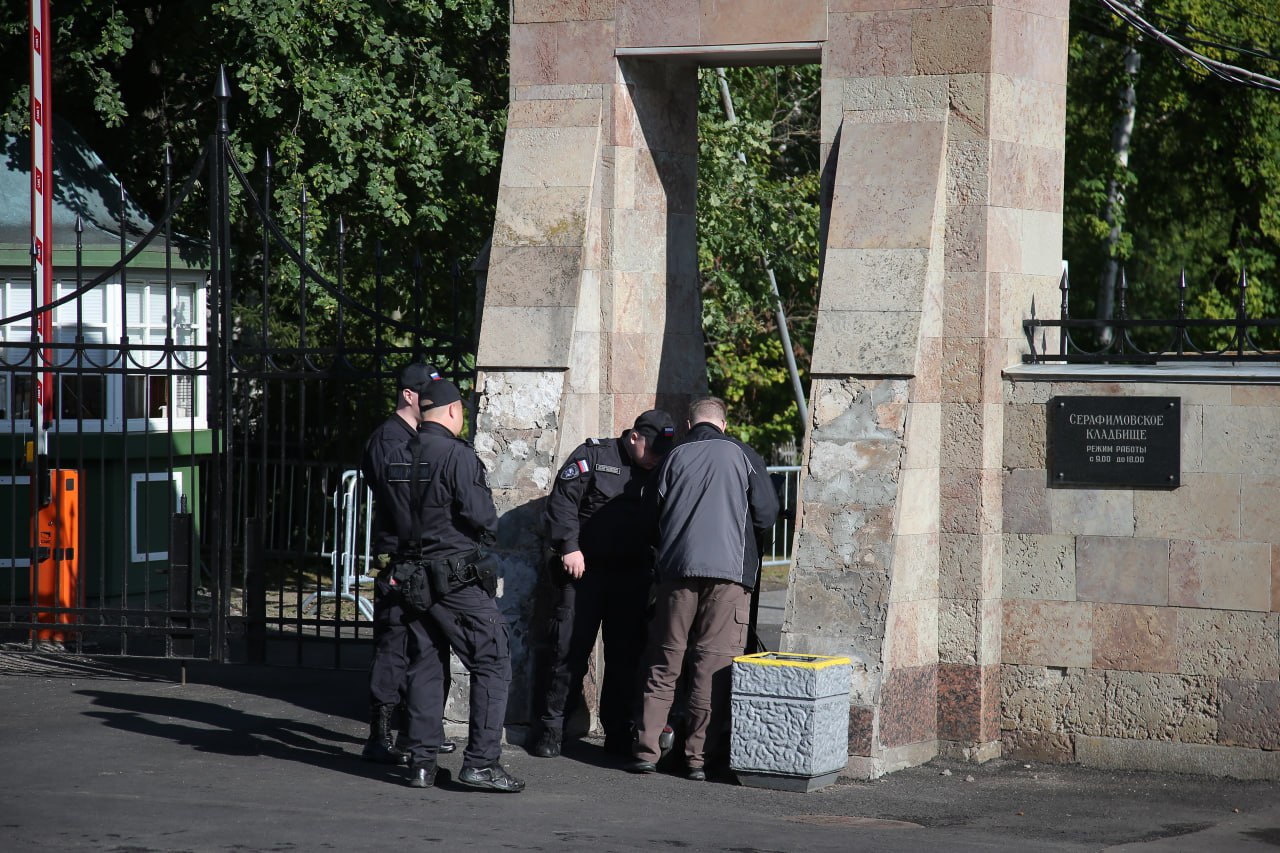 Около Серафимовского кладбища в Петербурге дежурят полицейские, подъезд перекрыт. "Фонтанка" сообщала, что патрульные машины появились около кладбища в ночь на 29 августа. На входе установили рамки металлоискателей.