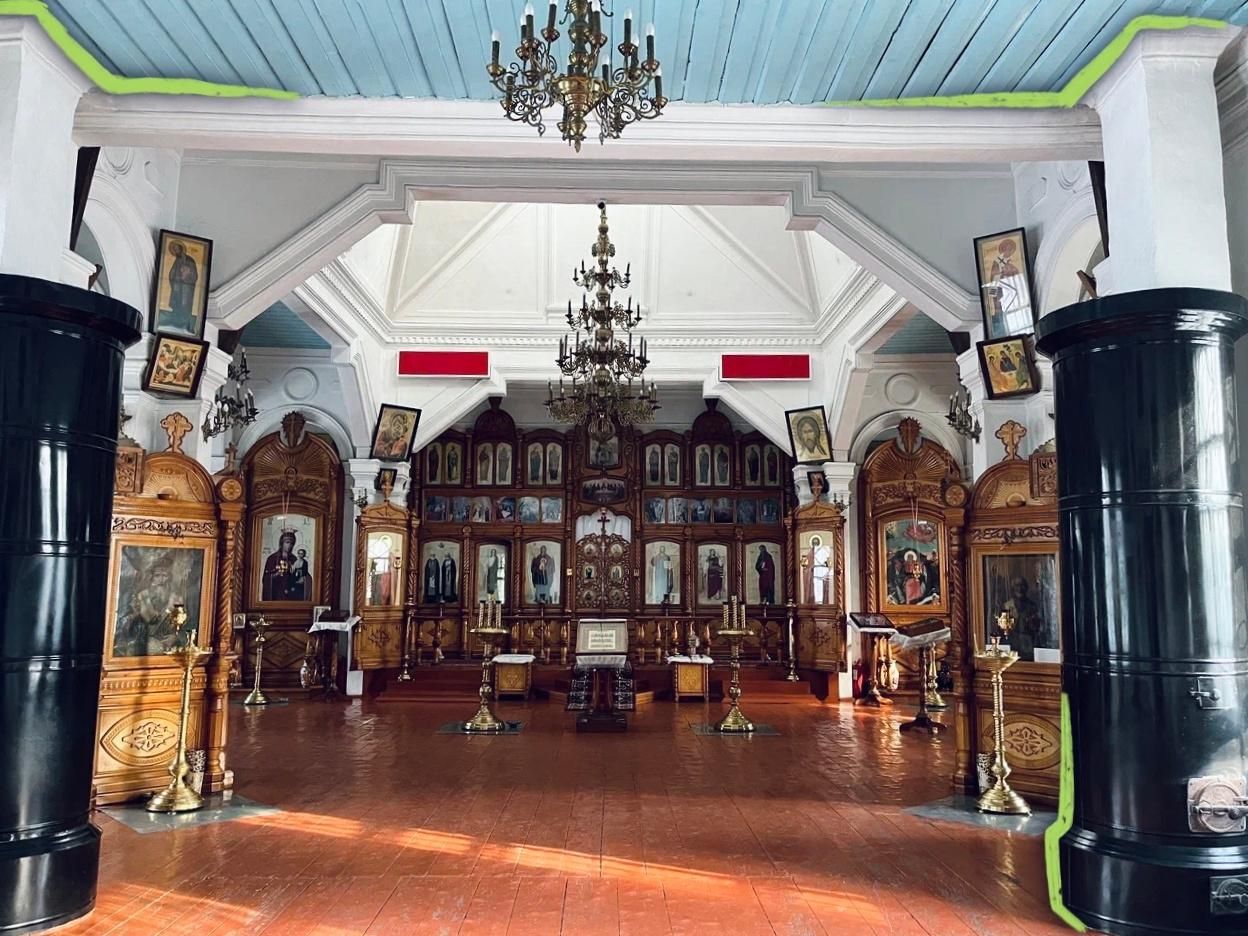 Храм во имя Пророка Божия Илии, в отличие от большинства российских церквей, полностью деревянный. Как говорят прихожане, здание постоянно обновляется: целые колокола снова повесили на окна, все четыре крыльца, киотыУкрашенный шкаф или полка для икон., иконостасПерегородка, отделяющая алтарь от всего остального. — новые, однако же половицы — те самые, что были при постройке. Каким-то чудом они выдержали времена Союза: в церкви было и зернохранилище, и спортзал педучилища, где велись уроки физкультуры и устраивались увеселительные мероприятия. На месте, где сейчас продают разного рода церковную утварь, была котельная, но уже два года как всё перевели на газовое отопление. Прихожане говорят, что это всё заслуга бывшего настоятеля церкви, ныне игумена Вианора, что прослужил в ней двадцать восемь лет и был инициатором масштабной реконструкции, а также дизайнером нового внутреннего обустройства храма.