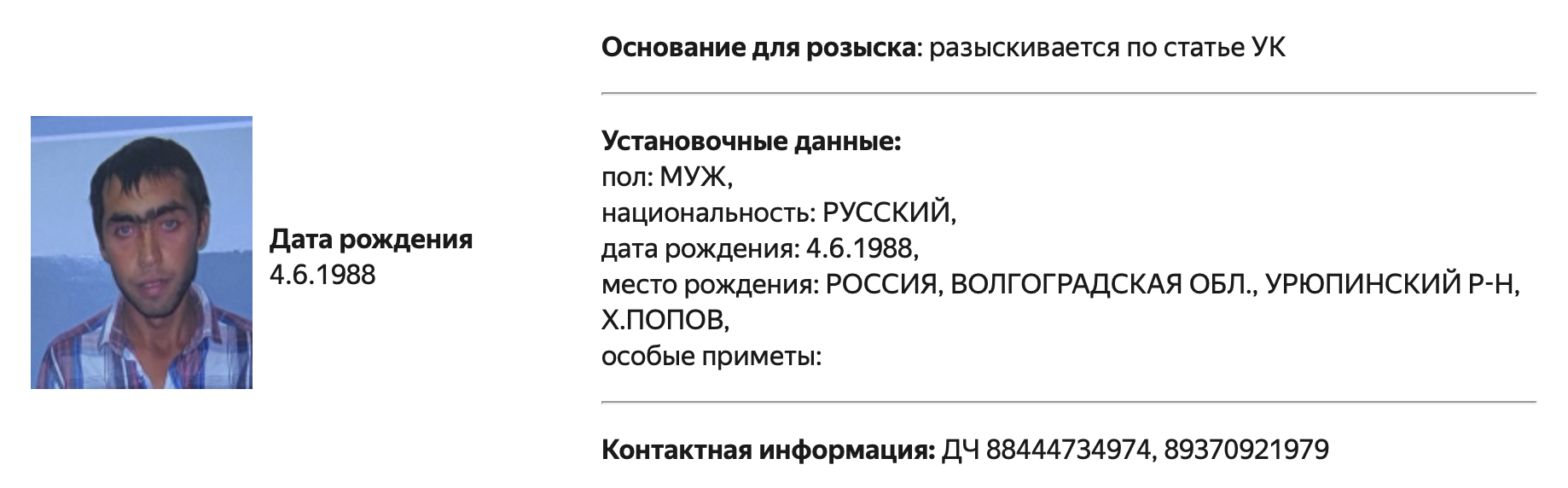 Карточка Алексея Хлебникова из базы федерального розыска МВД