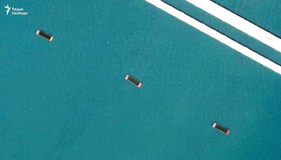 В распоряжении Радио Свобода появились спутниковые снимки сервиса Planet.com высокого разрешения, на которых видно, что к югу от моста встали на якорь или подтоплены семь барж. Глубина в этом месте не превышает 2–4 метров. Предположительно, суда будут использованы как основа для бонового заграждения против украинских дронов.