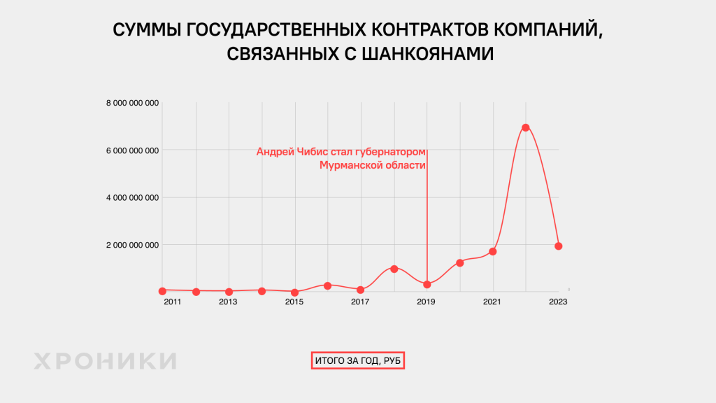 Вот, например, одна из старейших компаний Шанкоянов АО «Мурманскавтотранс». Занимается междугородними перевозками. С 2011 по 2019 год фирма получила госконтрактов лишь на 250 млн руб. А вот с 2019 года эта сумма составила уже 3 млрд руб. Или вот дорожно-ремонтное ООО «Аквариум». В 2018 году выручка этой компании была 45 млн, а с 2019 по 2022 уже более 3,2 млрд рублей. Госконтрактов из них — более трети (1,1 млрд).