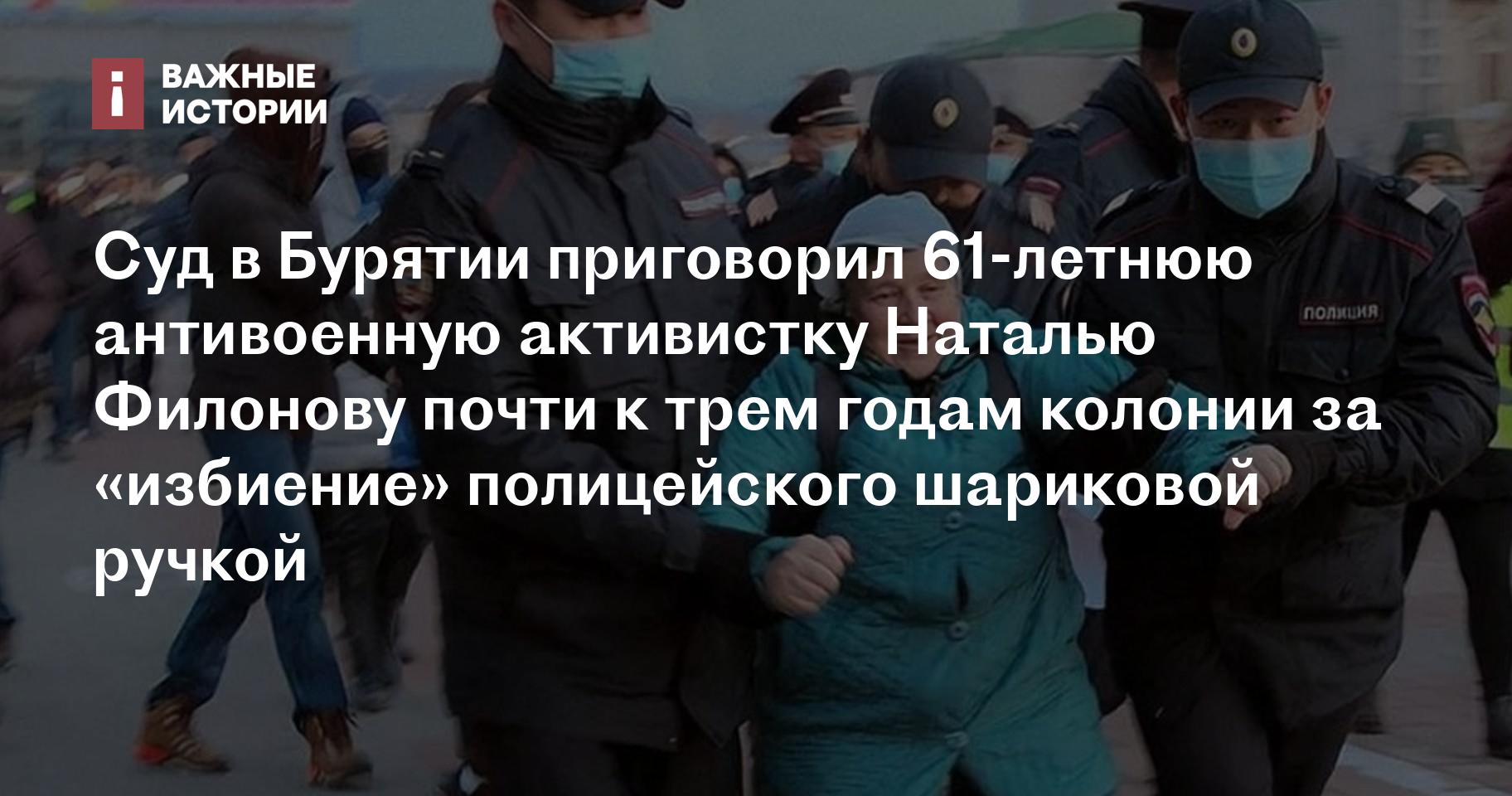 Суд в Бурятии приговорил 61-летнюю антивоенную активистку Наталью Филонову почти к трем годам колонии за «избиение» полицейского шариковой ручкой