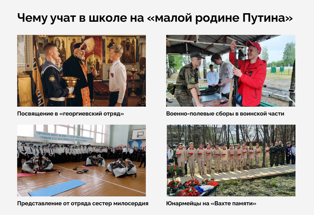 В субботу Кремль опубликовал фотографии посещения Владимиром Путиным 1 сентября новой школы в селе Тургиново Тверской области. Этот населенный пункт государственные СМИ называют «малой родиной президента» (здесь жили бабушка и дед президента). Сельское учреждение, получившее ко Дню знаний новое здание, известно акцентом на патриотическом воспитании детей – для девочек здесь существует отряд сестер милосердия, а мальчиков отправляют летом на военные сборы.