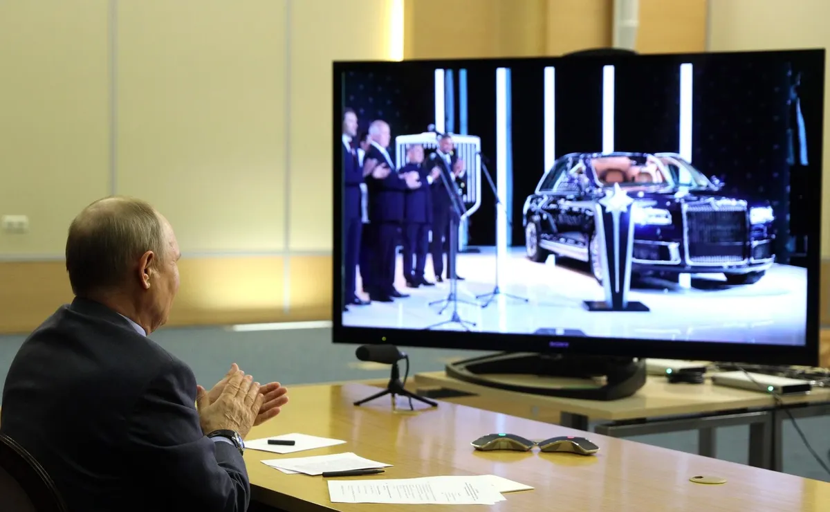 Владимир Путин смотрит трансляцию открытия в Татарстане завода по серийному выпуску автомобилей «Аурус», май 2021 года. Фото: Kremlin.ru