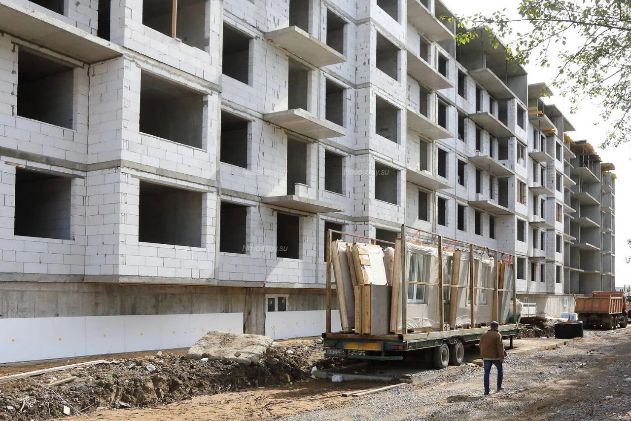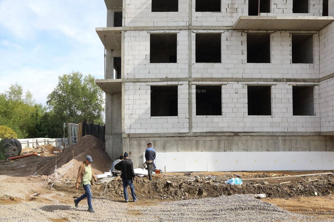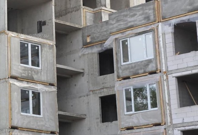 Многоэтажка в деревне Малое Карлино, квартиры в которой продавались как социальное жилье, построена в форме буквы "Н". Западное и восточное крыло из шести этажей и четырехэтажная "перемычка" между ними. В западном крыле фасадные стены действительно из газобетонных блоков, как и было прописано в разрешительных документах на ввод здания в эксплуатацию. Жителям удалось найти несколько фотографий дома на этапе строительства, на которых виден материал стен в обеих частях здания.
