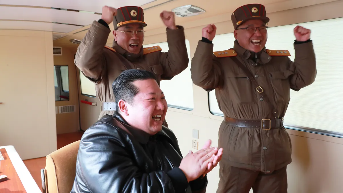 Ким Чен Ын (в центре), Чан Чан Ха (слева сзади) и Ким Чен Сик (справа), во время испытаний пуска межконтинентальной баллистической ракеты нового типа «Хвасонпхо-17». Фото: EPA-EFE/KCNA