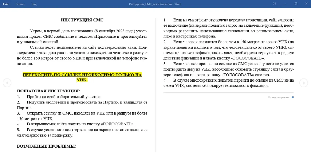 Скриншоты с похожей инструкцией, но в формате документа Word, опубликовал красноярский телеграм-канал «Борус». Утверждается, что ее разослали сотрудникам городской администрации. В указаниях написано о том, как пользоваться сервисом геолокации, чтобы подтвердить явку на выборах. В документе сказано, что сервис работает в радиусе 150 метров от избирательного участка.