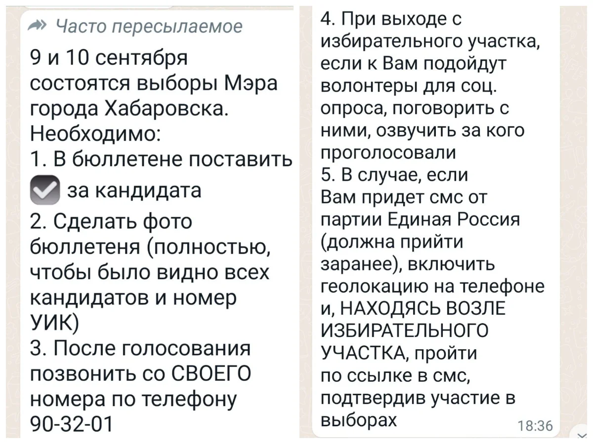 Инструкцию по использованию данного сервиса также публиковали местные хабаровские паблики. Утверждается, что указания разослали работникам бюджетных учреждений. В них говорится, что сотрудники должны сделать фото бюллетеня как подтверждение участия в голосовании, а также отзвониться по указанному в инструкции номеру после выхода из избирательного участка.