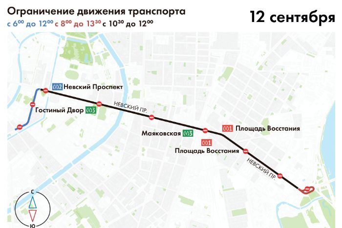 - Невском проспекте, от Казанской улицы до проспекта Александра Невского, — с 10:30 до 12:00. В обход будут ездить троллейбусы №№ 5, 7, 10 и 11.