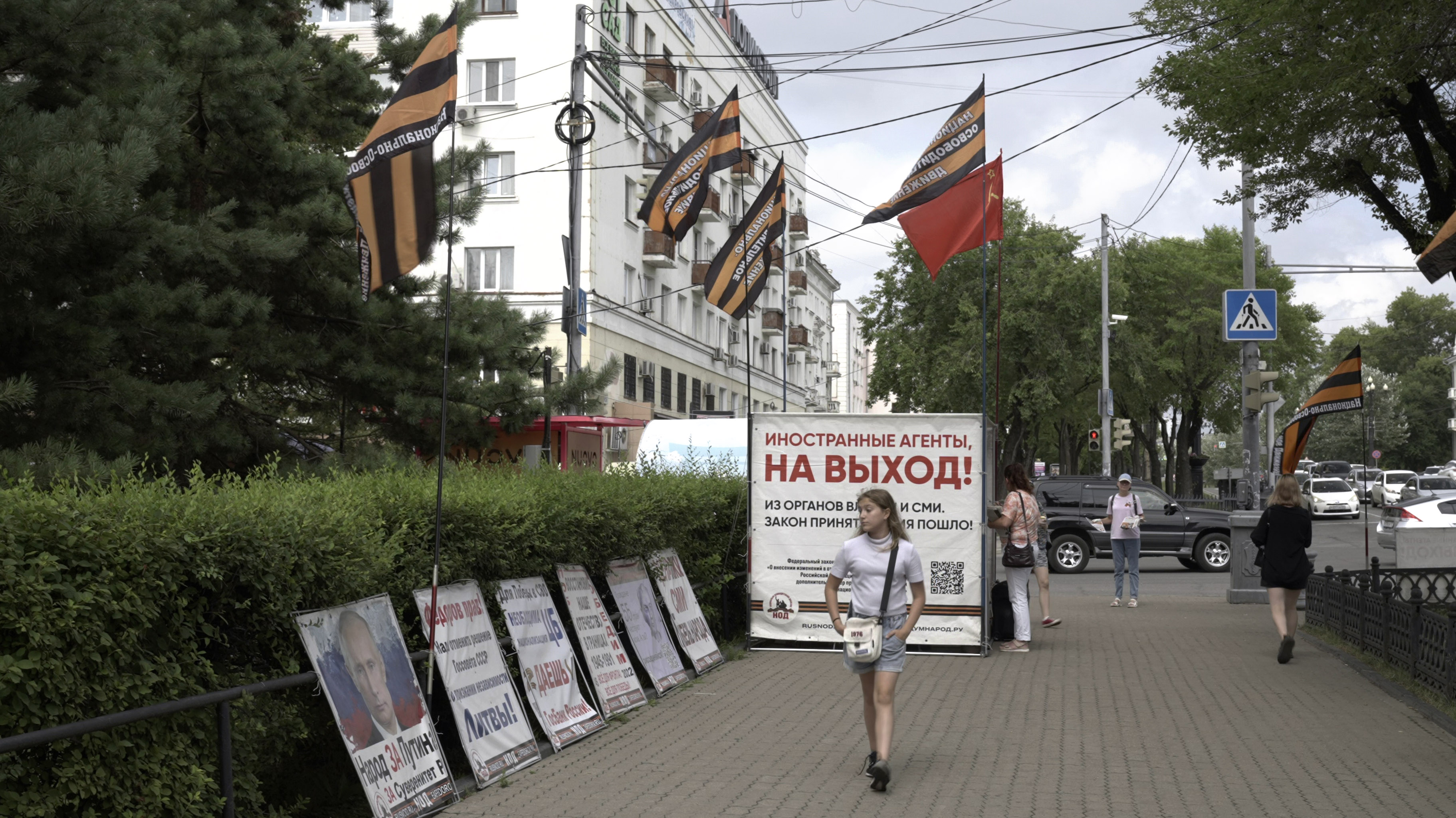 Плакат "Присоединяйся к своим" высится среди хрущевок на окраине Хабаровска. Как и всюду в России, здесь много агитации, призывающей идти на фронт. Молодой человек в темной одежде и кепке с длинным козырьком останавливается рядом, расстёгивает рюкзак. Яйца одно за другим летят в плакат, с гулким стуком разбиваются о фигуры военных моряков. Редкие вечерние прохожие даже не поворачивают головы.
