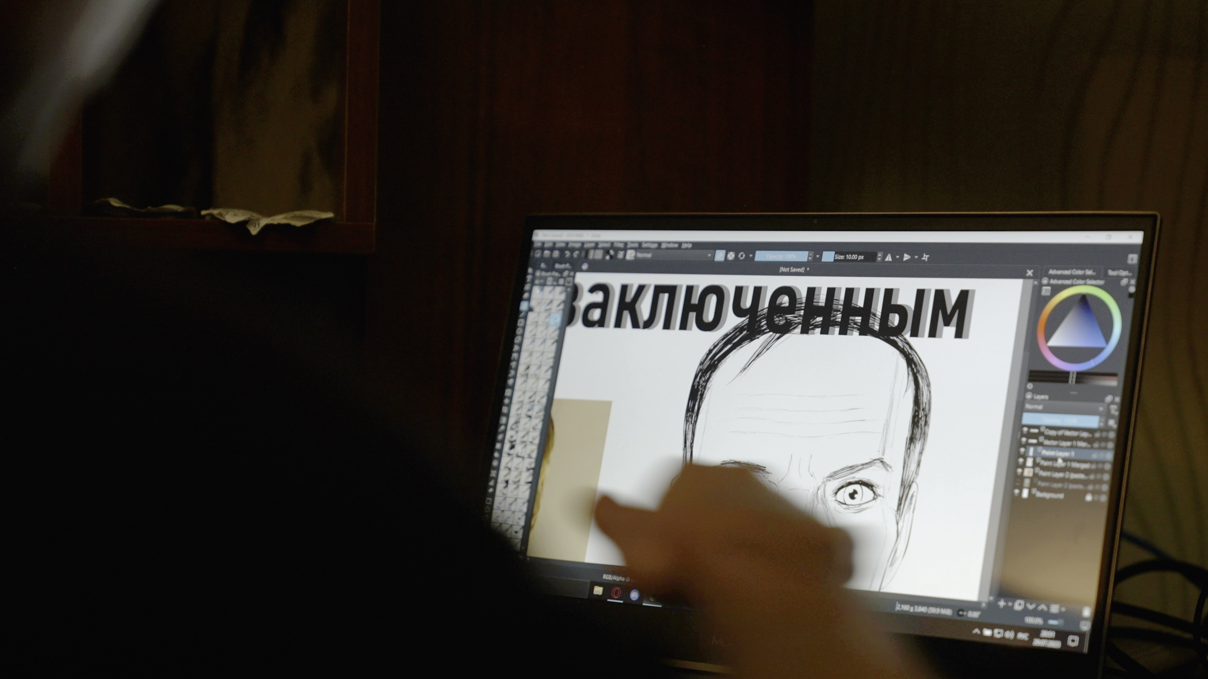 Художник увеличивает картинку и рисует черный круг – центр зрачка Навального. Недавно ему звонили из военкомата, предлагали идти на фронт.