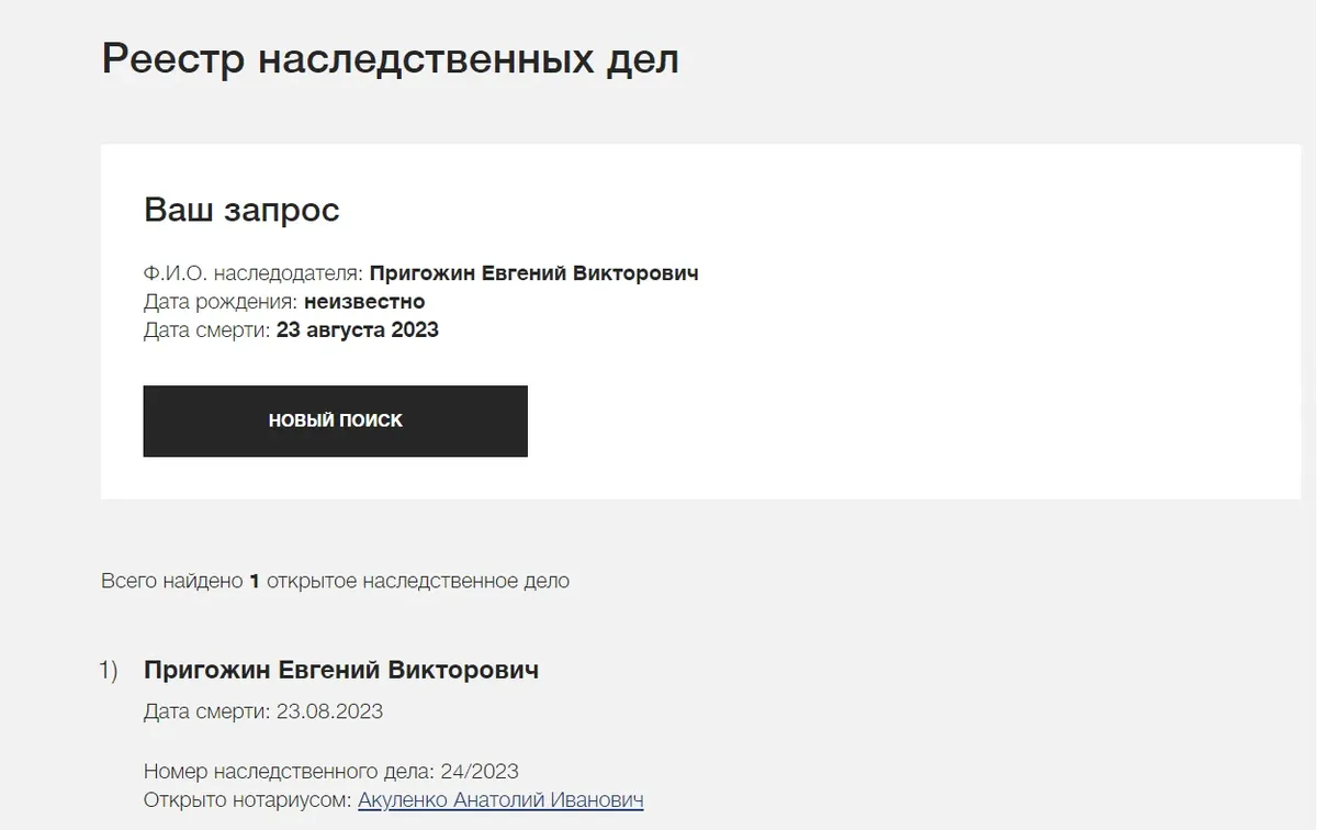 В качестве даты смерти указано 23 августа 2023 года, как и на могиле Пригожина. Дело было открыто нотариусом Нотариальной палаты Петербурга Анатолием Акуленко.