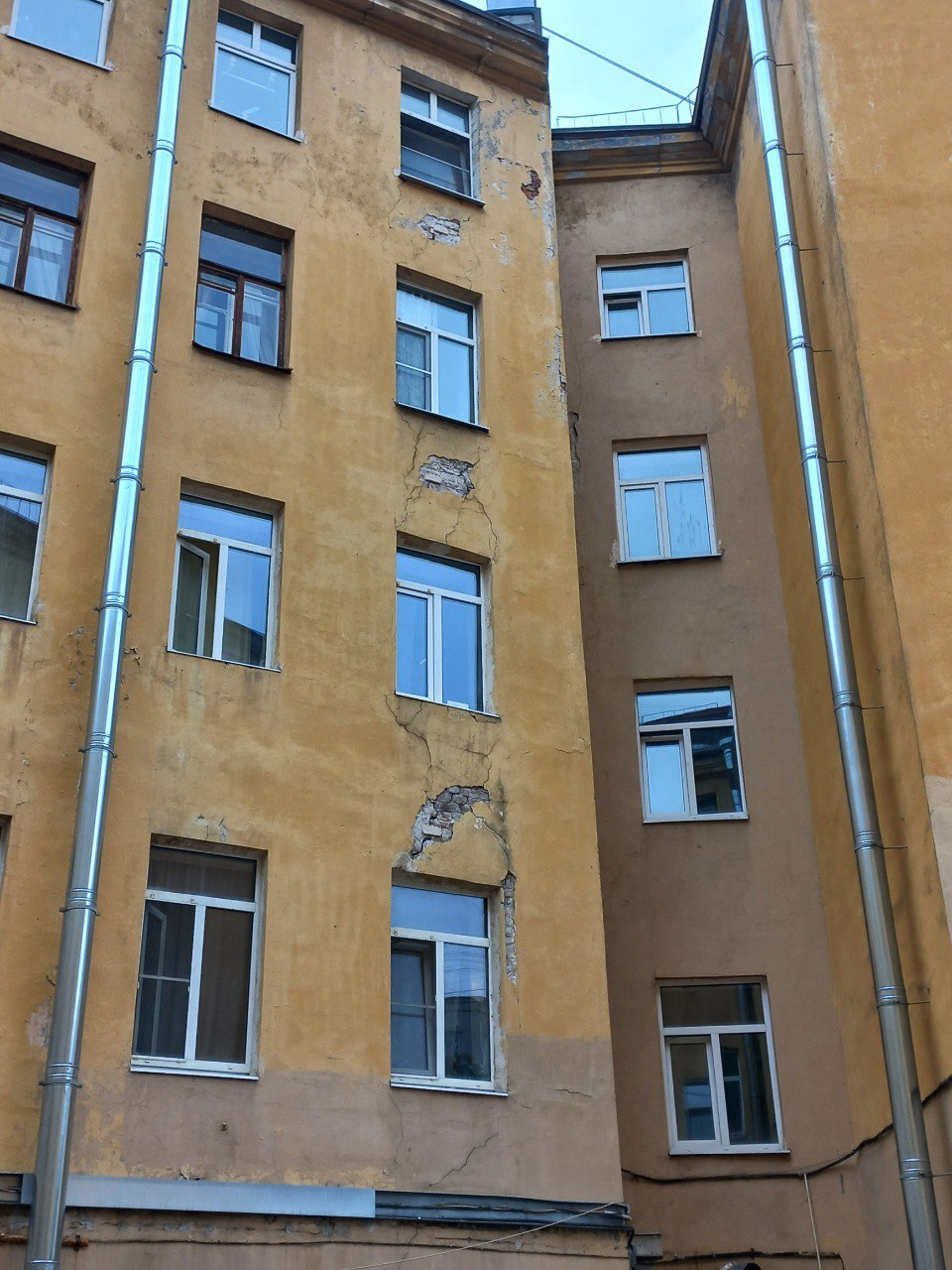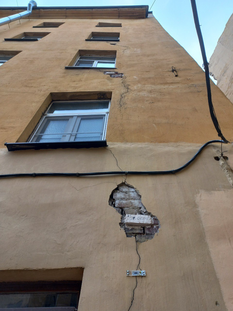 — Три огромные трещины пересекают дом, прямо разрезают от основания до самого верха. И одна трещина [идет] со стороны улицы Лизы Чайкиной — она делит дом реально на две части. Еще две огромные трещины есть со стороны двора, они практически выгрызают из дома кусок, — рассказал Мухин.
