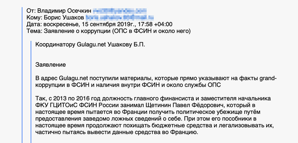 Знакомого зовут Павел Щетинин и во Франции он оказался по приглашению Осечкина. До 2016 года Щетинин работал во ФСИН, в частности, в Главном центре инженерно-технического обеспечения и связи × , где руководство, по словам самого Щетинина, × попыталось вовлечь его в коррупцию, а после отказа вынудило уволиться. Осечкин опубликовал материалы Щетинина на «Гулагу.нет», обещал вывезти его из России и обеспечить международную защиту, утверждает Щетинин × . Но когда Щетинина начали вызывать на допросы, помощь от Осечкина не подоспела. Фсиновец сампо поддельному паспорту, который, как он утверждает, ему помогли сделать бывшие коллеги по МВД × выбирался из России. Во Франции Осечкин сказал, что уже нашел адвокатов, которые помогут Щетинину получить убежище, — за 40 тыс евро на семью из пяти человек, по словам Щетинина × . Заплатив часть суммы, Щетинин начал ждать обещанных адвокатов, но так их и не увидел, утверждает он × , зато выяснил, что стоимость их услуг вероятно преувеличена едва ли не в десять раз. Бывший фсиновец написал Осечкину гневное письмо, которое имело совершенно неожиданные для Щетинина последствия.