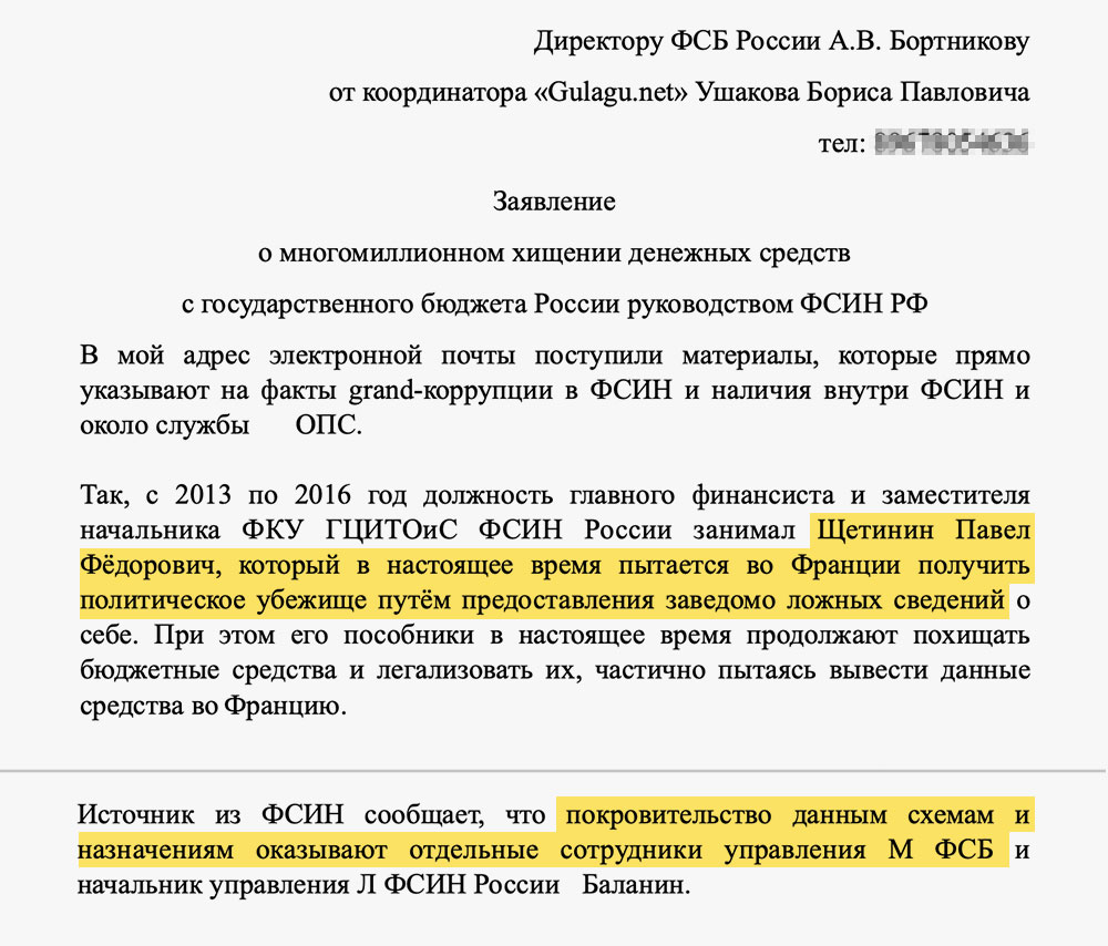 Вскоре после его отправки бывшего чиновника по запросу России задержал Интерпол. Разобравшись в ситуации, французы его отпустили — тогда-то Щетинин выяснил, что именно Осечкин раскрыл ФСБ его местоположение, и Москва отправила запрос на экстрадицию. Заявление о том, что Щетинин находится во Франции и оттуда продолжает «координировать коррупционную схему ФСИН», и видео со Щетининым на французском празднике, Осечкин попросил отправить в приемную ФСБ координатора «Гулагу.нет» Бориса Ушакова, признался Ушаков «Проекту». Письма от Осечкина Ушакову и от Ушакова в ФСБ есть в распоряжении «Проекта».