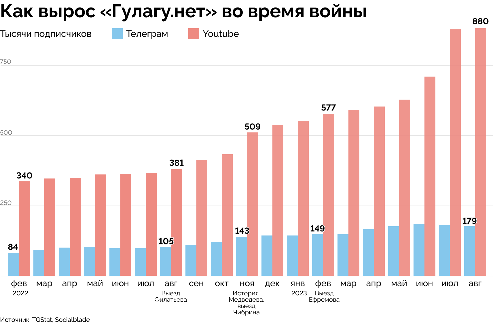 На фоне войны в Украине и благодаря громким «сенсациям» «Гулагу.нет» значительно прирос аудиторией. С января 2022 года аудитория Youtube- и Telegram-каналов «Гулагу.нет» выросла больше чем вдвое— с 325 тыс подписчиков в январе 2022 года до 880 тыс в августе 2023 года на Youtube, и с 85 тыс подписчиков в феврале 2023 года до почти 180 тыс в августе 2023 в Telegram × .