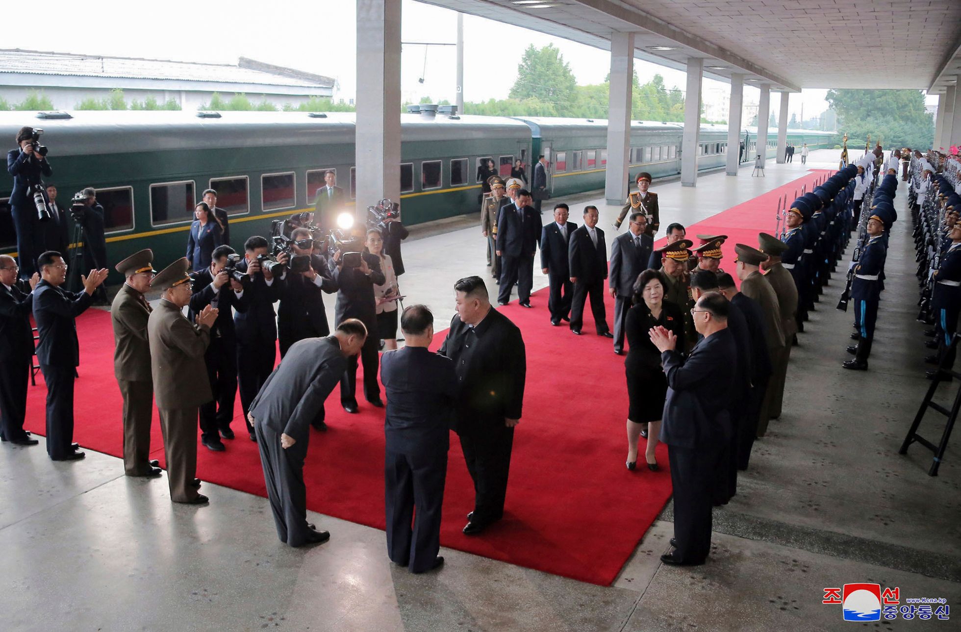 На бронепоезде Ким Чен Ын ехал из Пхеньяна. Центральное телеграфное агентство Кореи (ЦТАК) распространило фотографии торжественной церемонии проводов Ким Чен Ына на вокзале столицы Северной Кореи. На снимках, сделанных 10 сентября, показаны, в частности, парадные расчеты нескольких родов войск.