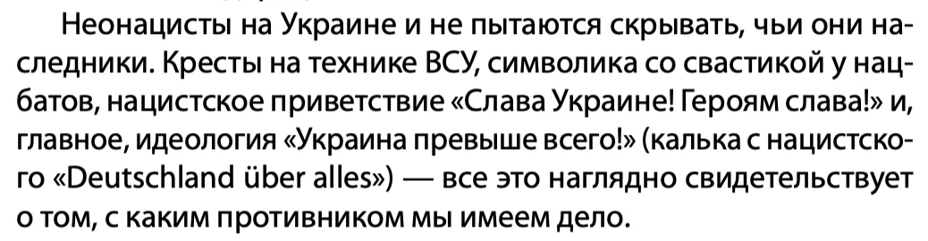 Фраза «нацистское приветствие “Слава Украине! Героям слава!” и, главное, идеология “Украина превыше всего!” (калька с нацистского “Deutschland über alles”)» повторяется в книге несколько раз. Общий посыл — постоянное сравнение, во-первых, с гитлеровской Германией как таковой, и, во-вторых, обязательное сравнение с ее финалом: «…современные украинские неонацисты, их главари и военнослужащие ВСУ должны также помнить о приговоре Нюрнбергского трибунала 1946 года нацистским военным преступникам. Несмотря на то что западные страны и киевский неонацистский режим забыли о необходимости соблюдения норм международного гуманитарного права, Российская Федерация добьется их исполнения в ходе и по результатам СВО», — пишет Шойгу. Владимир Мединский в разделе «к читателям» добавляет: «Такое страшно цитировать. Но нужно знать, чтобы понимать, с кем и с чем приходилось сталкиваться тогда и вновь — сейчас».