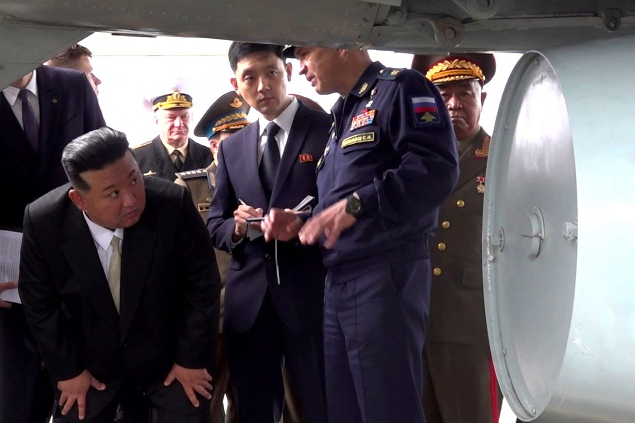 Russian Defence Ministry / AFP / Scanpix / LETA Ким Чен Ын (слева) осматривает российский военный самолет во время посещения аэродрома Кневичи, 16 сентября 2023 года