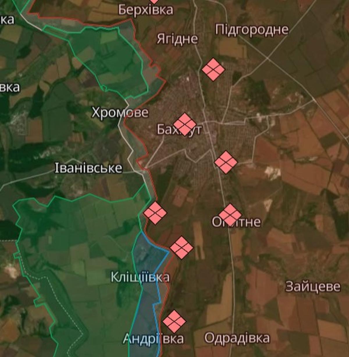 В конце прошлой недели ВСУ сообщили об освобождении Андреевки и Клещеевки — двух ключевых сёл для российской обороны на правом фланге под Бахмутом. Эти населенные пункты важны для логистики армии РФ и связи с Горловкой. Несмотря на успех на этом направлении, говорить об окружении Бахмута пока рано, отмечает OSINT-проект DeepState.
