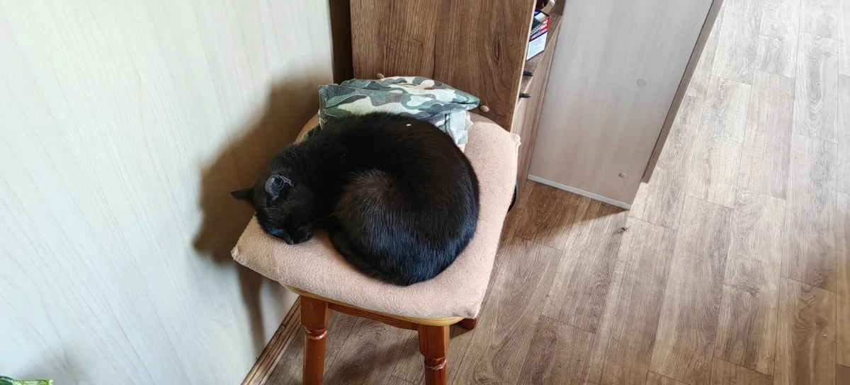 В контейнере, ставшем домом для его маленькой семьи, спартанское убранство, в очередной раз подчеркивающее функциональность обыденных предметов. Диван стал кроватью, холодильник превратился в тумбу под дешевый китайский телевизор, попутно выполняя роль шкафчика для лекарств. Стол, табуретка и спящий, свернувшийся в клубок, черный кот. По словам Алексея, животинка прибилась к нему сама. Видимо, как и он сам, кот остался без дома.