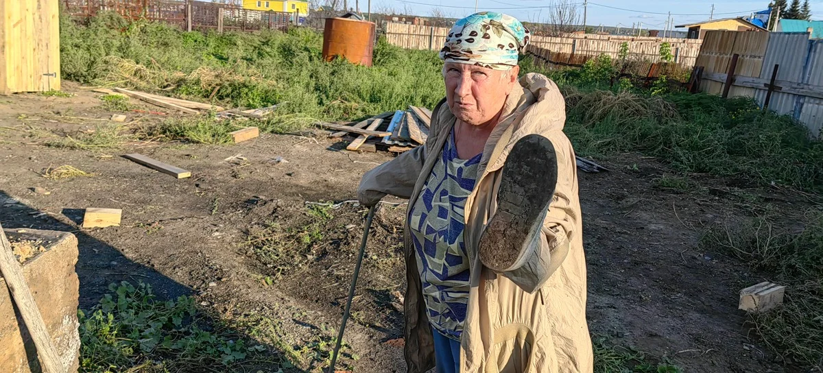 Спустя пять месяцев туфельки прохудились, в разошедшиеся швы то и дело попадают камни и мелкий мусор, из-за чего, опираясь на ветку, туфли Людмиле приходится часто снимать и вытряхивать.