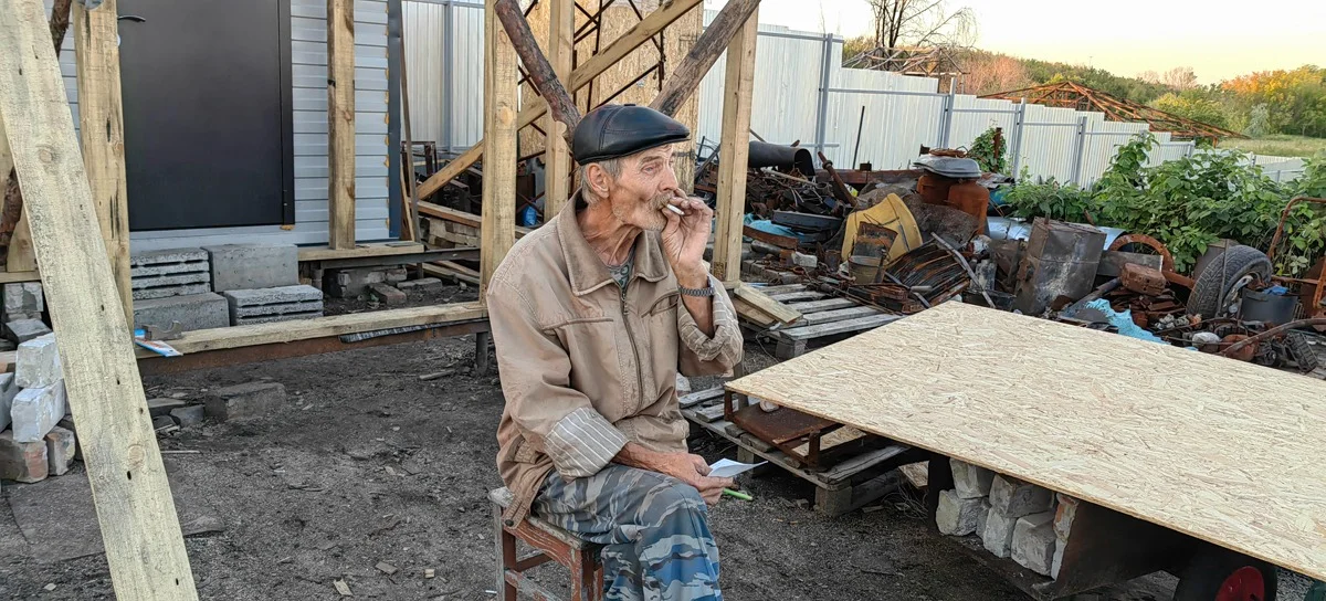 Кепка, бежевая куртка, усы и сигарета — у Алексея типаж человека из другой эпохи. Он как будто вылез из телевизора, из какого-то второразрядного фильма про неунывающих советских людей, которых, кажется, не напугать ни пожаром, ни чиновничьим хамством, ни строительным вагончиком, где ему с супругой предстоит пережить эту зиму. Мне кажется, случись даже ядерная война, единственное, о чем будет переживать мужчина, — это сохранность мастерской. Когда мы познакомились с ним в мае, всего через несколько дней после пожара, меня поразила огромная, зияющая глубиной в пару этажей дыра на месте гаража, доверху заваленная обгоревшими станками. Это была погибшая мастерская: последние 30 лет мужчина «шабашил по металлу». Варил оградки, точил детали для тракторов и ремонтировал мотоблоки… Теперь восстанавливает свое рабочее место.