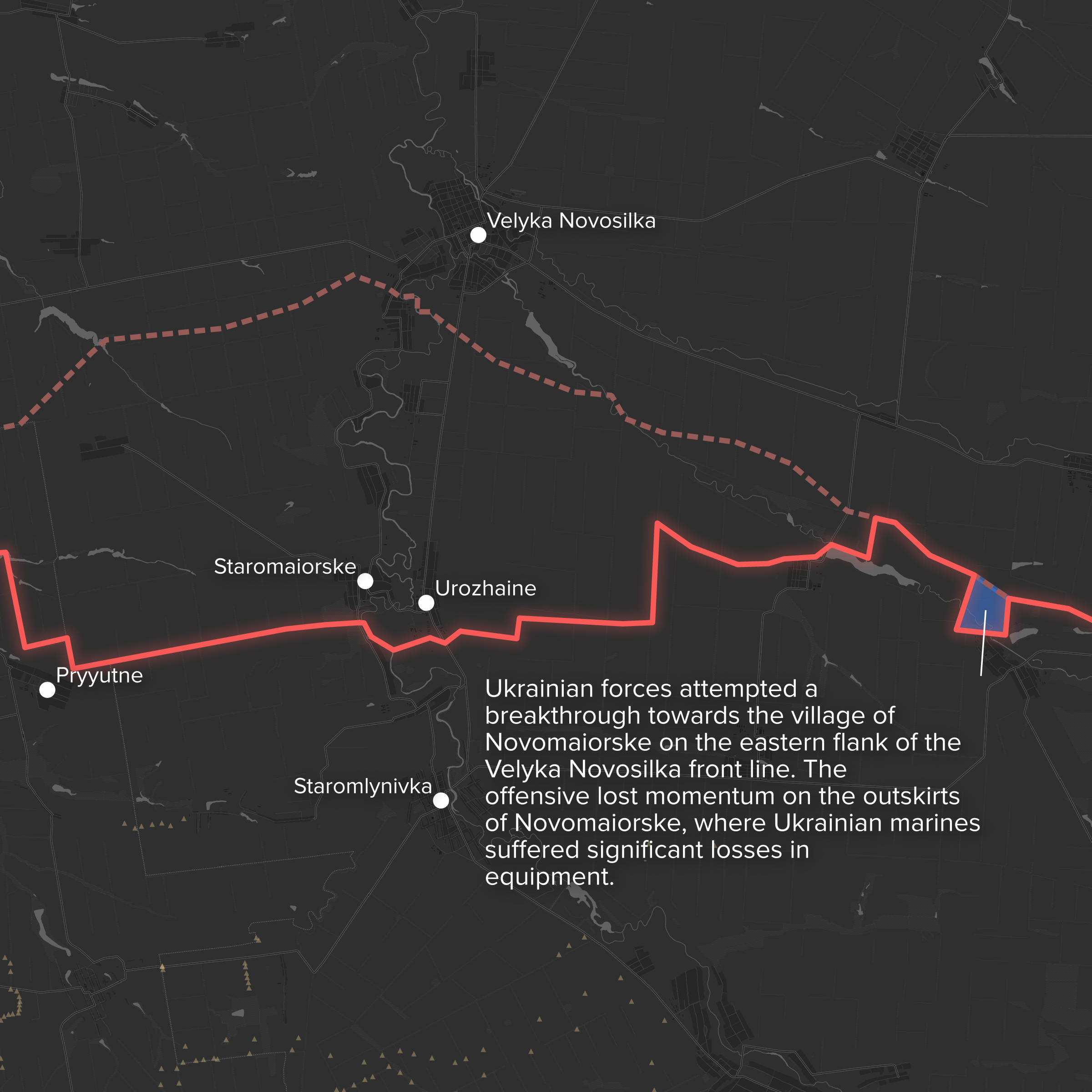 - The Ukrainian offensive south of Velyka Novosilka, along the Mokri Yaly River, has ground to a halt after the liberation of Urozhaine in August. To keep advancing further, the AFU had to secure the flanks of the offensive, which they couldn’t do without bringing in additional reserves. In early September, their assault on Pryyutne on the western flank of the operation was fruitless. The mid-September offensive on Novodonetske and Novomaiorske was also unproductive. The AFU couldn’t secure new positions on the outskirts of either, but lost a significant amount of equipment while trying.